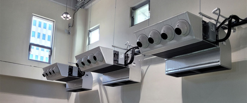 천정형 제트크루저유니트 : 작업자를 최우선으로 공조하며 바닥치환공조, 타겟공조, 선택적 국부공조를 수행하는 대공간 공조장치.